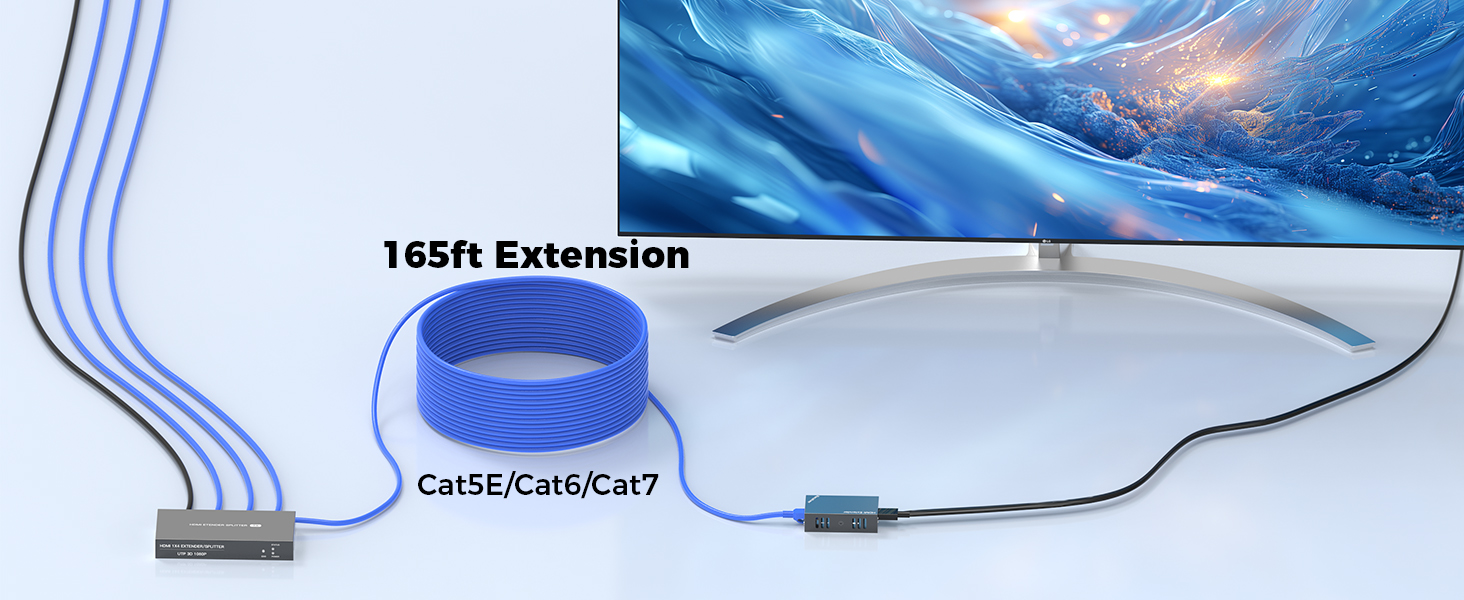 The HDMI Extender Splitter 1x4 allows you to transmit high-definition audio and video signals over long distances using standard Ethernet cables. With support for 1080P@60Hz and a range of up to 50m, this device is ideal for various applications, including home entertainment and professional settings. Its Power over Cable feature simplifies installation, making it a must-have for seamless connectivity.