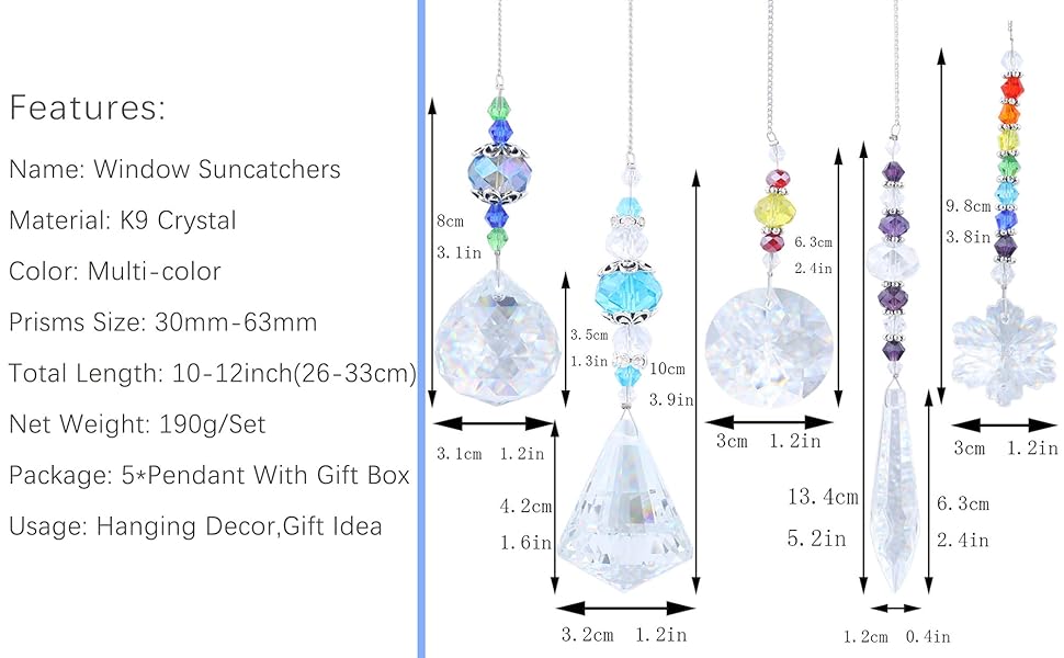 The YU FENG 5 Pcs Crystal Suncatchers set features five 10-12 inch multi-shaped K9 crystal pieces that refract sunlight into vibrant rainbows, perfect for window decoration, chandeliers, or gifting on special occasions.