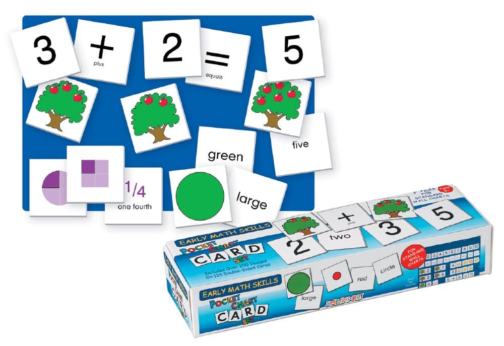 The Lauri Pocket Chart Cards - Early Math Skills set includes 126 durable, double-sided cards designed to teach children essential math concepts from counting to simple equations. Ideal for ages 4 and up, these cards feature colorful illustrations and are perfect for both classroom and home environments, complete with an activity guide to enhance the learning experience.