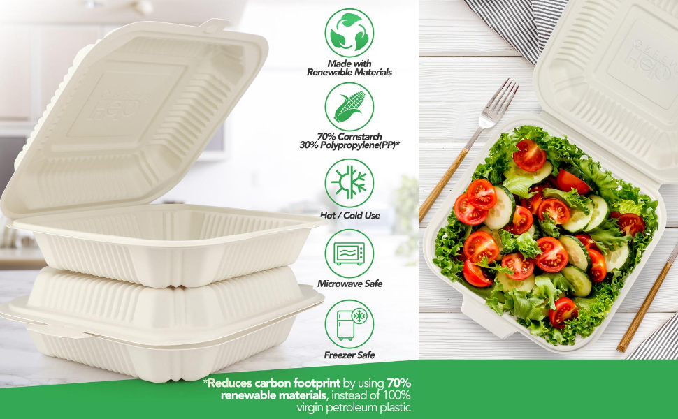 - ✅ CARE FOR THE PLANET – Containers are made from cornstarch, a renewable resource, and with small percentage of PP#5 that helps save our planet!