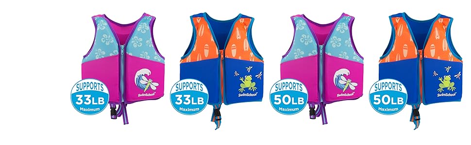 - FABRIC FLOTATION VEST: Comfortable, soft fabric form-fit vest designed to propel your child forward to promote use of arms and legs and swim position.