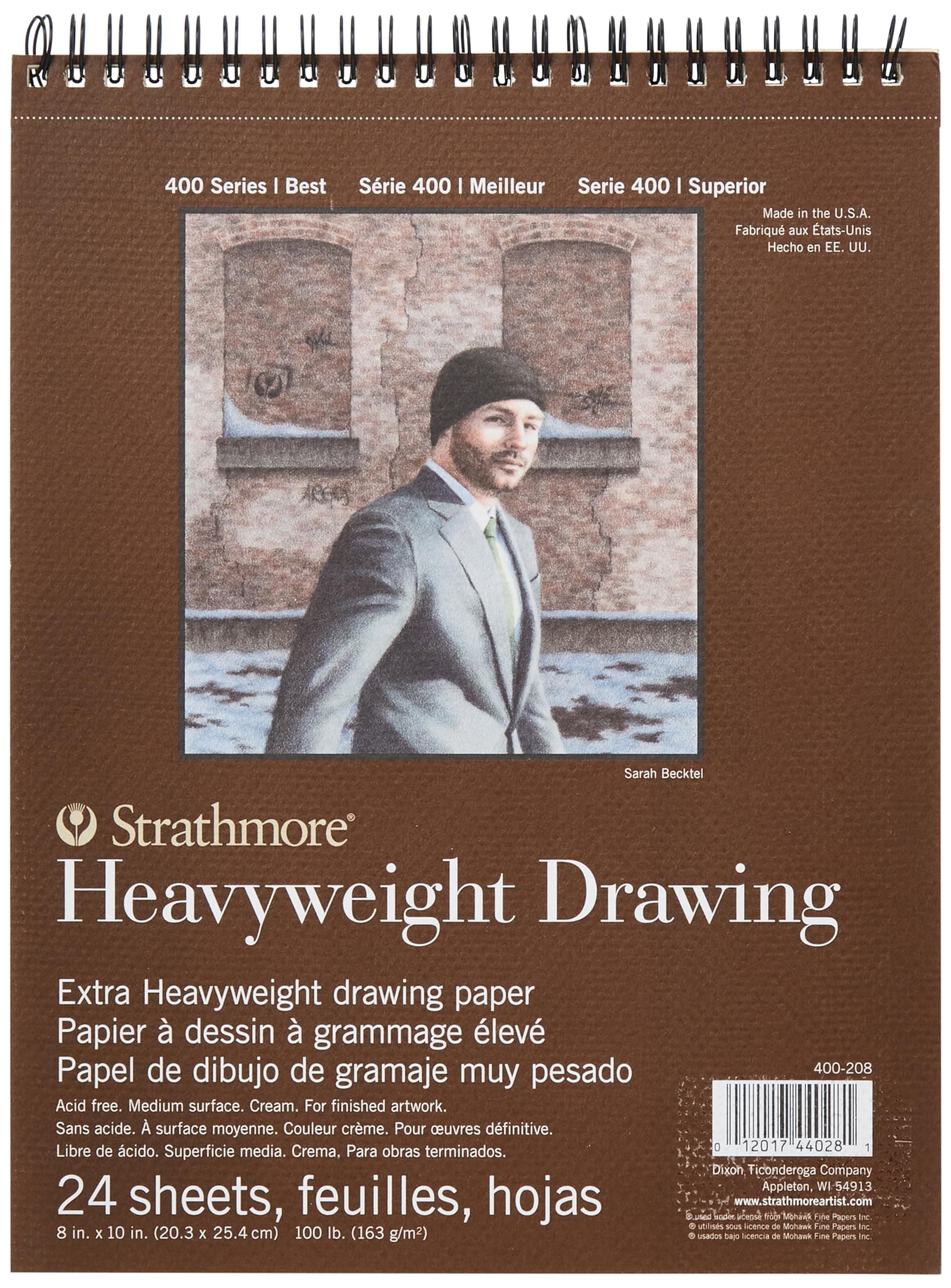 The Strathmore 400 Series Heavyweight Drawing Pad features 24 sheets of 8"x10" cream-colored, acid-free, 163 gsm paper with a medium surface texture, ideal for pencil, colored pencil, charcoal, and sketching sticks. Wire-bound for convenience, it’s designed to support professional-quality final artwork.