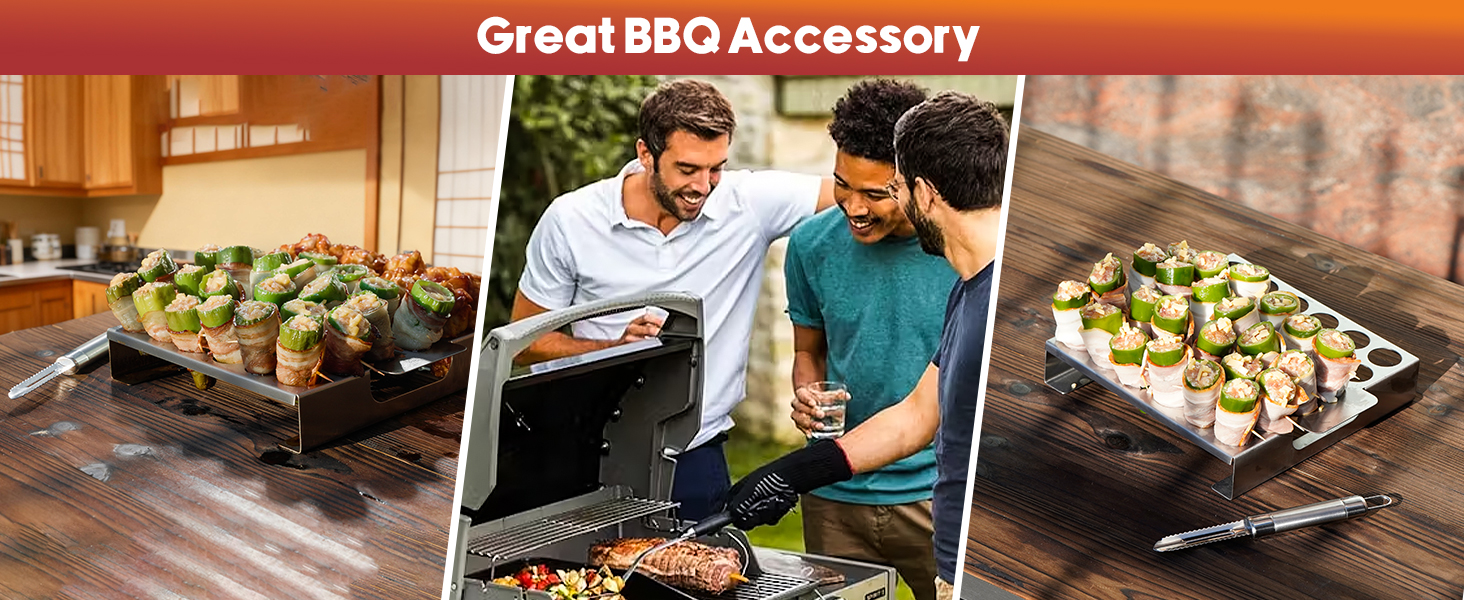 My wife grows jalapeños at home, and she usually harvests lots of them. This jalapeño holder is ideal for making jalapeño poppers. It is made of steel and is much sturdier than I expected. It is definitely sturdy enough to use on the grill. If your jalapeños are too thin they will fall through the holes if you don’t put a pan or baking sheet underneath the holder, but this is no big deal. The included tool for scooping out the insides of each jalapeño is a nice perk. Really handy and built well.If you like jalapeño poppers, this is a great rack to hold them for the grill, smoker, or oven.