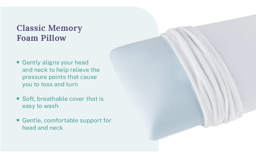 Sleep InnovationsClassic Memory Foam Pillow, Standard Size, Head and Neck Alignment, Side, Stomach, and Back Sleepers, Medium Support, White