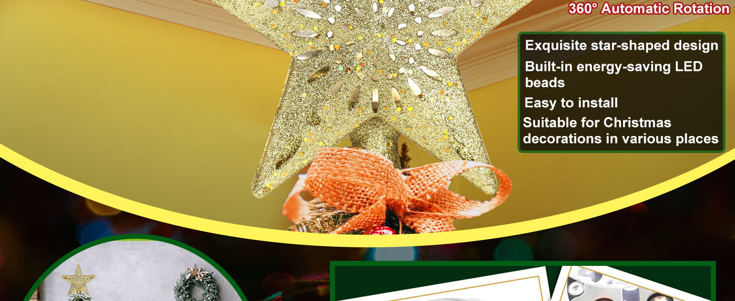 The Ryhpez Christmas Tree Topper is a stunning 9.8-inch golden star featuring a built-in LED rotating snowflake projector. Designed for easy installation and compatibility with various tree sizes, this eco-friendly topper creates a mesmerizing snowfall effect, making it a perfect addition to your holiday decor or a thoughtful gift for friends and family.
