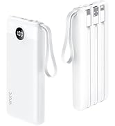 So far very happy with my purchase of this portable charger. I like having the different cords available including iPhone and USB-C. It was heavier than I expected but not a problem as I carry a bag. It charges quicker than others I've owned and provides a good amount of chage ro a few devices. Cant beat the purple colour and so far has been working very well. It's slightly bigger than my iPhone 12 and about twice as thick but feels well made. Good price compared to others on the market. Digital screen brightly shows how much charge is left. Great buy, seems well designed with all the cords tucking in, and it came with a bag to protect it.