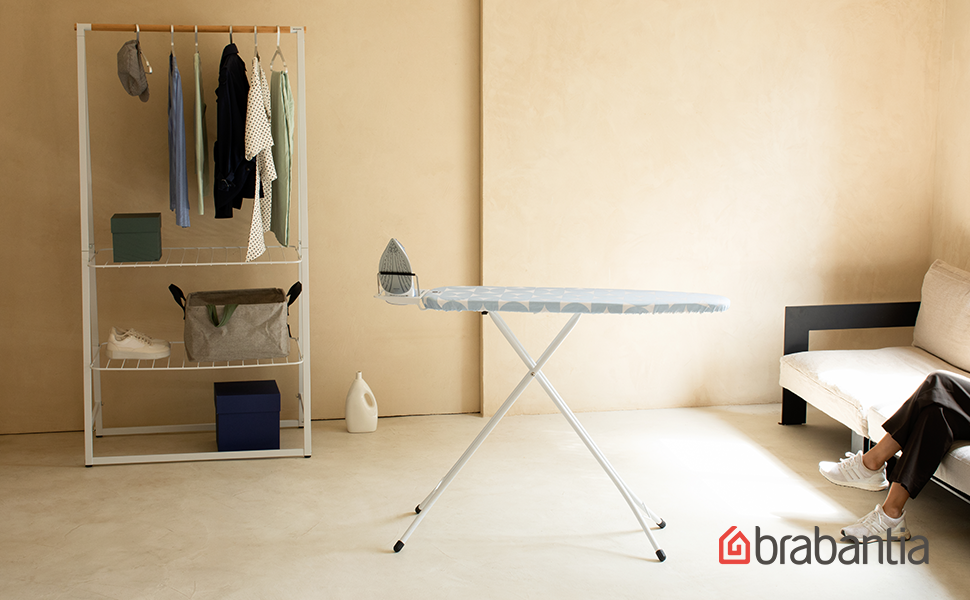 The Brabantia Ironing Board A combines flexibility and sustainability with its adjustable height, steam iron rest, and eco-friendly materials. Designed for both left and right-handed users, this compact and foldable board ensures a crease-free finish while prioritizing safety with its child lock feature. Plus, enjoy peace of mind with a 10-year guarantee!