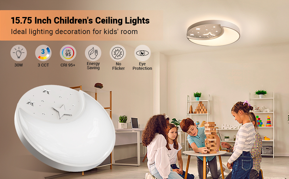 The FAYOTAT 30W Flush Mount Ceiling Light combines energy-efficient LED technology with a charming moon and star design, offering three selectable color temperatures (3000K, 4500K, 6500K) and a memory function for personalized ambiance. Delivering 2750 lumens of high-CRI light, itโs perfect for bedrooms and kidsโ rooms, ensuring both aesthetic appeal and family safety with built-in electrical protections.