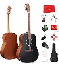 The Vangoa Dreadnought Acoustic Guitar is a 41-inch full-size steel-string guitar designed for beginners and advanced players alike. Featuring a basswood body with X-bracing, walnut fretboard, and Okoume wood neck, it offers rich tonal quality and comfortable playability. The kit includes essential accessories like a digital tuner, capo, strap, picks, and a padded gig bag, making it a complete starter bundle. Its matte black finish and refined tuning gears ensure both style and precision, backed by a 2-year after-sale service.